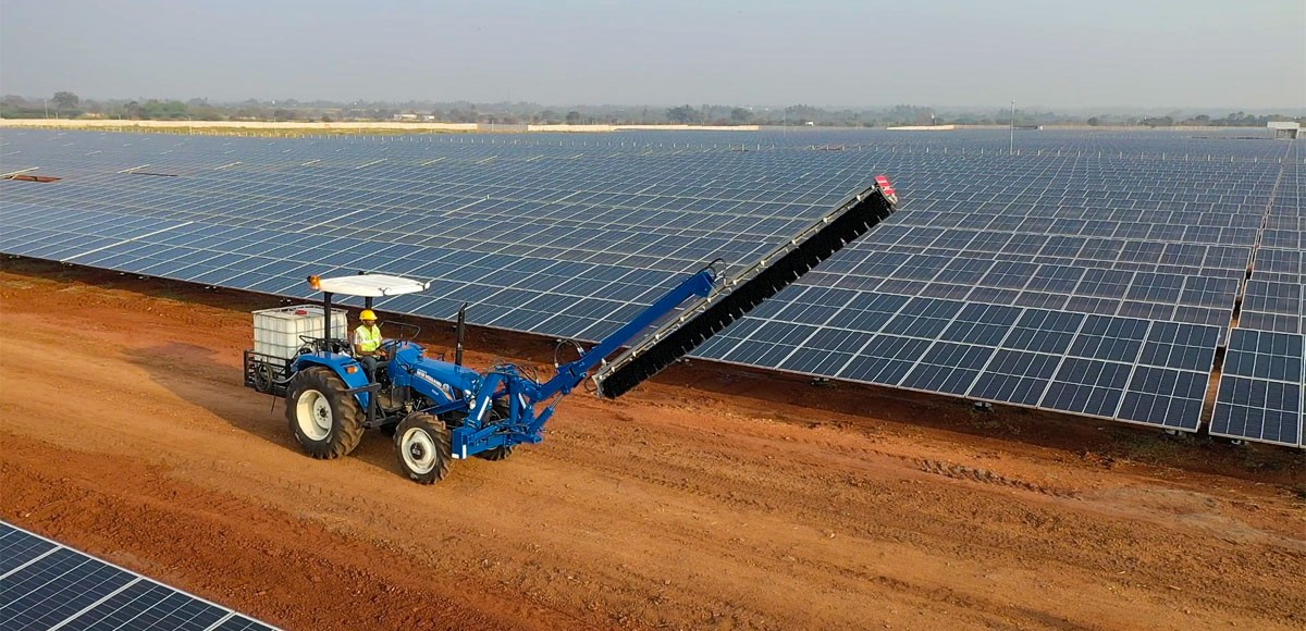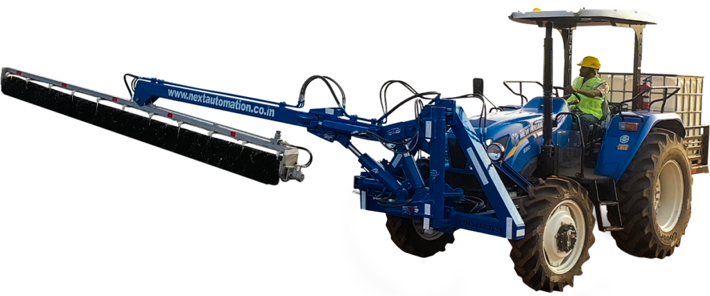 A solar panel cleaning tractor is a tractor-mounted system designed to clean solar modules. It includes a cleaning brush, a water storage unit, and a hydraulic control system. The tractor provides the power needed for hydraulic operations. This system supports both dry and wet cleaning, unlike other methods that offer only one. It works in any soil condition and effectively removes large amounts of dirt while passing through solar panel arrays. Water usage can be adjusted by modifying the water outlet setup.
